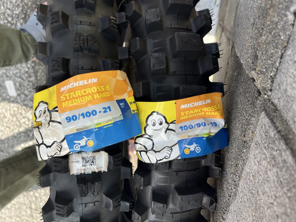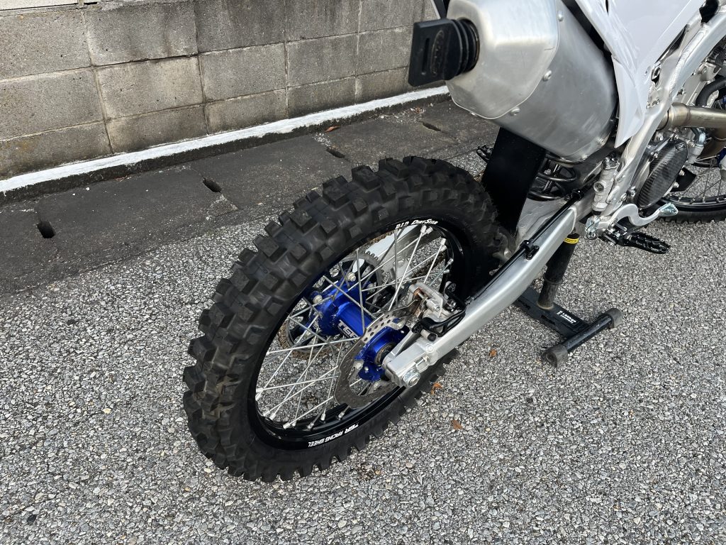 今までリアタイヤは標準よりワンサイズ太い110/90-19のサイズを使っていたのですが、今回は乗った感覚がどれくらい変わるのか知りたくて標準サイズの100/90-19に変更。久しぶりのモトクロスタイヤ交換だったのでメチャクチャ苦労しました(^^;; なんとか前後ともパンクさせずに交換できたのでセーフ。